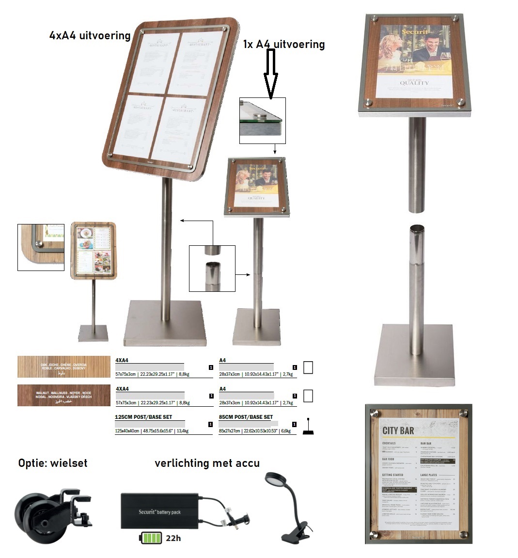 Hoogwaardig afgewerkte info display van lichtbruin eiken blad afgewerkt met daarop aangebracht een glasplaat waarachter de info/menu geplaatst wordt. Geschikt voor 4x A4. Voorzien van een staander van 125 cm hoog en een stevige voetplaat van 40x40 cm. Het geheel weegt 22,2 kg. Geschikt voor buiten- en binnengebruik. Optie: verlichting en verrijdbaar maken met wielset.