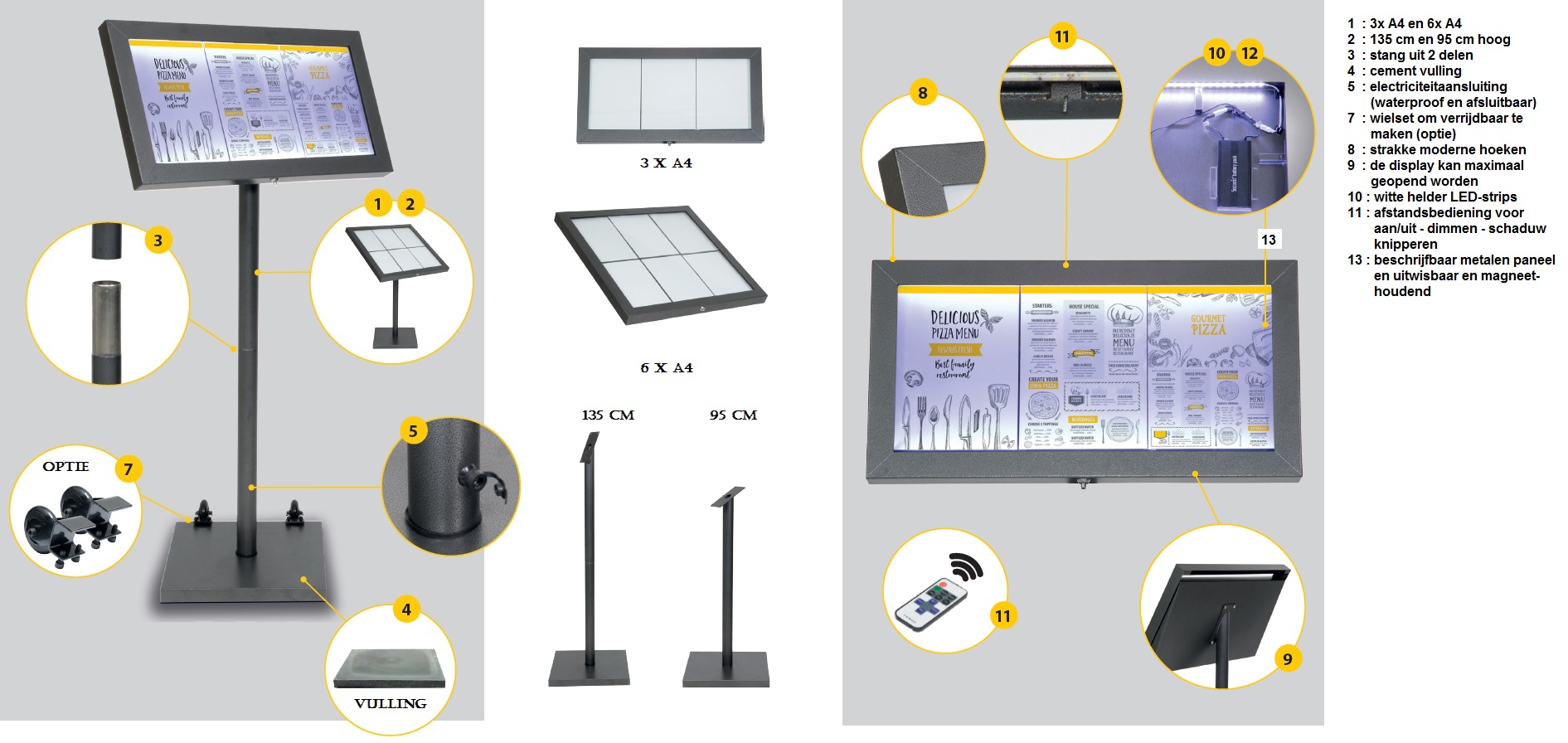 Hoogwaardig afgewerkte LED info display van gelakt staal voor presentatie van bedrijfsinformatie, menu voor bar ofwel restaurant. De vitrine heeft een magnetische achterwand en de voorzijde is uitgerust met veiligheidsglas en is afsluitbaar. Naar voren openend d.m.v. gasveren. Geschikt voor 6x A4. Geschikt voor binnen en buiten gebruik. LED verlichting met 48 LED's, incl. 220V adapter met 5 m kabel. Optie: voor een draadloossysteem zijn speciale oplaadbare batterijen tegen meerprijs verkrijgbaar
